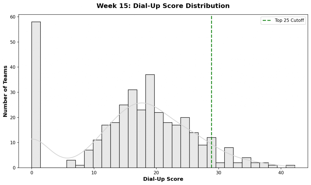Figure 4: Distribution of Dial-Up scores across all Division I teams. The top 25 teams (highlighted in green) represent those with the most extreme performance splits based on opponent quality.