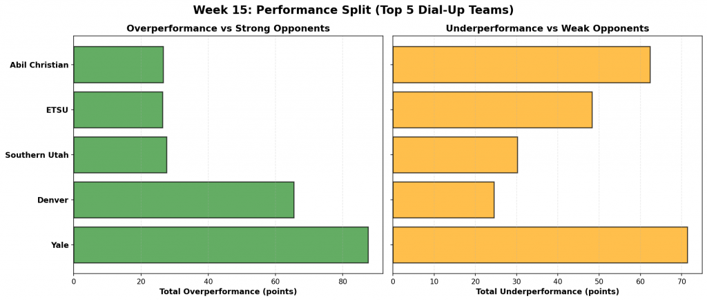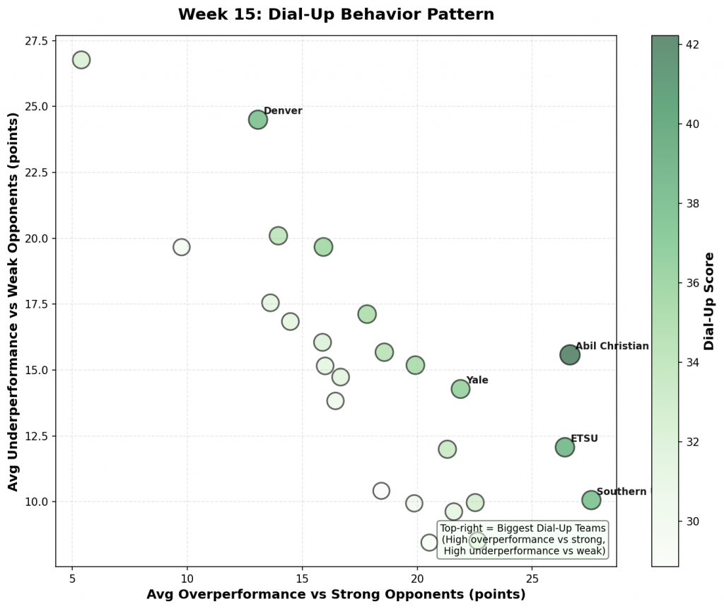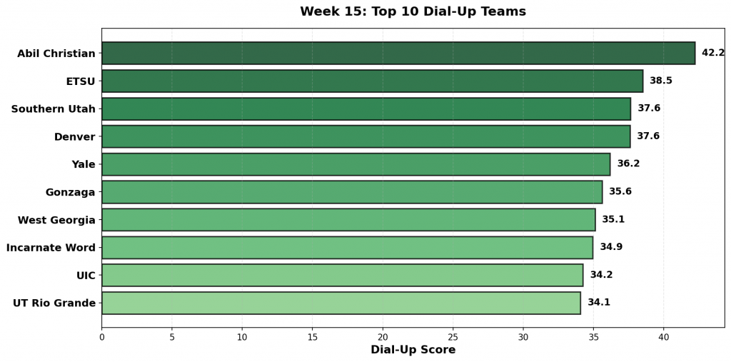 Figure 1: Top 10 teams with the highest Dial-Up scores in Week 15. Scores reflect the combination of overperformance against strong opponents and underperformance against weak ones.