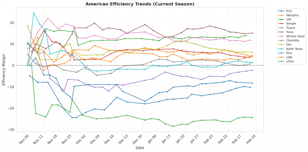 Figure 1: Efficiency margin trends for American teams throughout the season. Teams trending upward show improving performance, while downward trends indicate struggles.