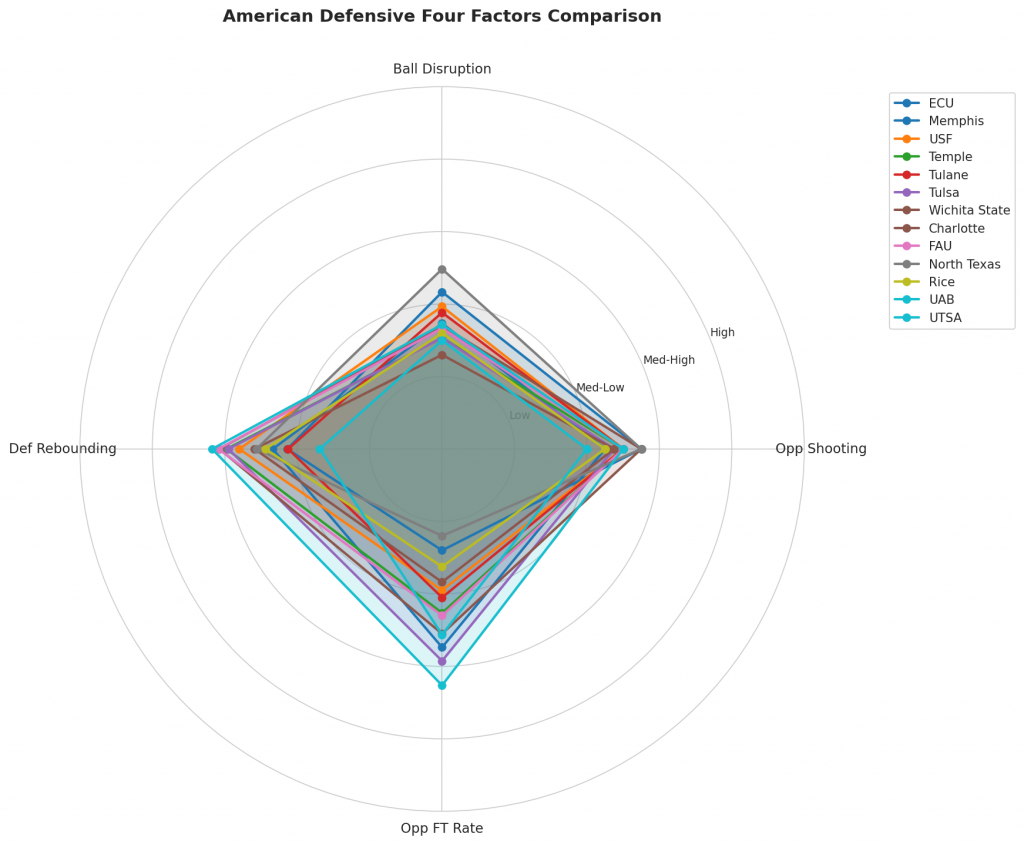 Figure 3: Defensive Four Factors comparison across American teams. The radar chart shows each team’s opponent shooting defense (Opp eFG%), ball disruption (forcing TOV%), defensive rebounding (DREB%), and opponent free throw prevention (Opp FT Rate).