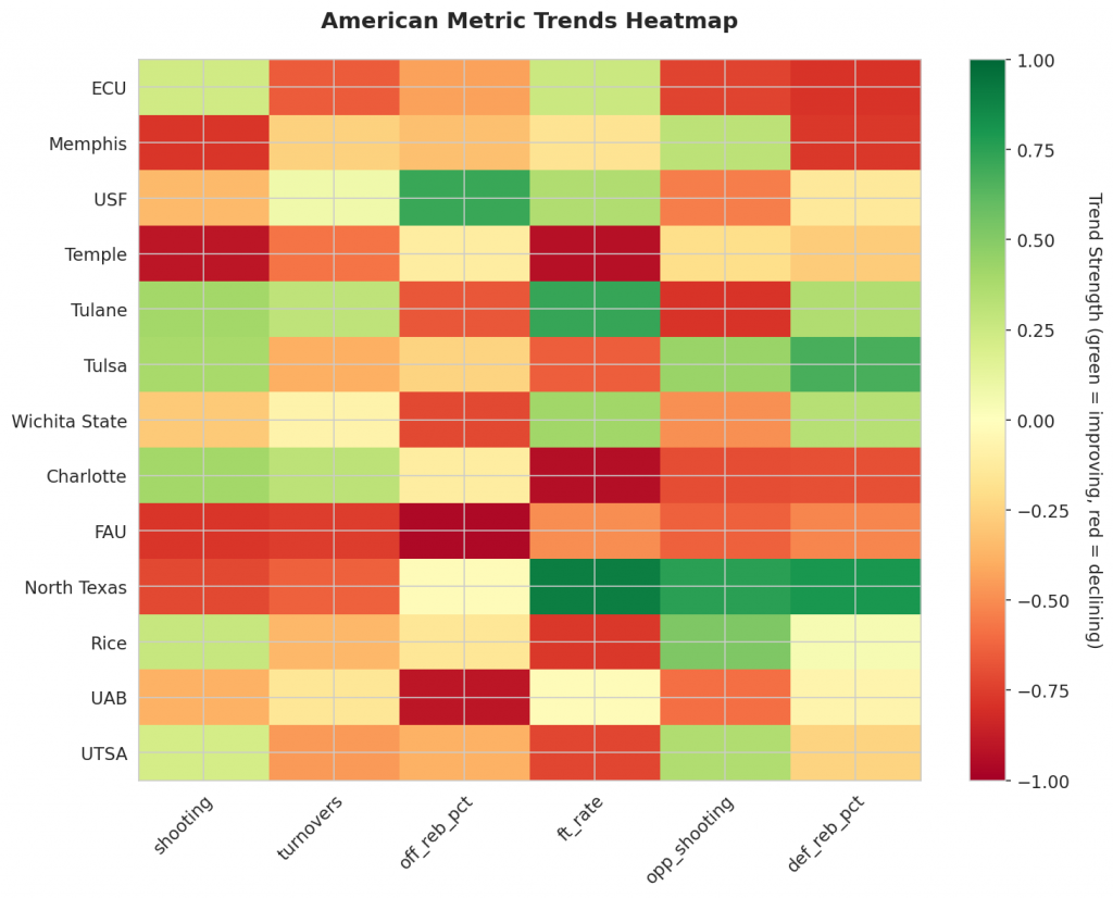 2. Tulane, Off Reb Pct, Down, Trend Strength: -0.015 – Tulane’s inability to secure rebounds effectively presents a major issue contributing to their overall team performance.