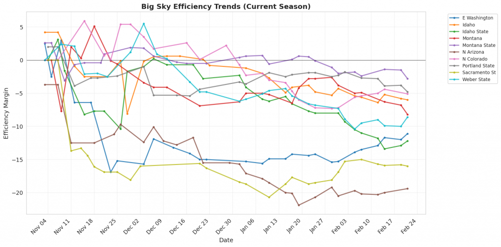 Figure 1: Efficiency margin trends for Big Sky teams throughout the season. Teams trending upward show improving performance, while downward trends indicate struggles.
