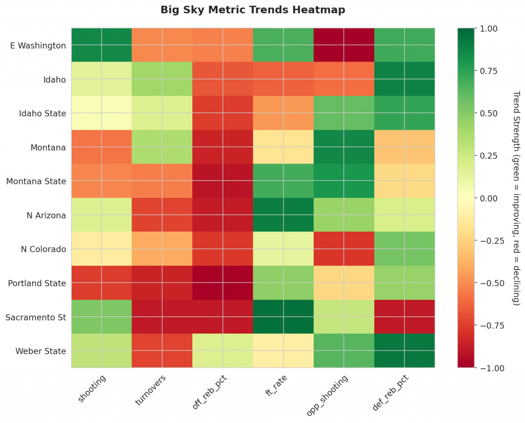 The Big Sky conference has several teams showing promising signs of improvement on both ends of the court. Our analysis highlights key trends that will help identify which teams are genuinely improving versus those riding unsustainable momentum.