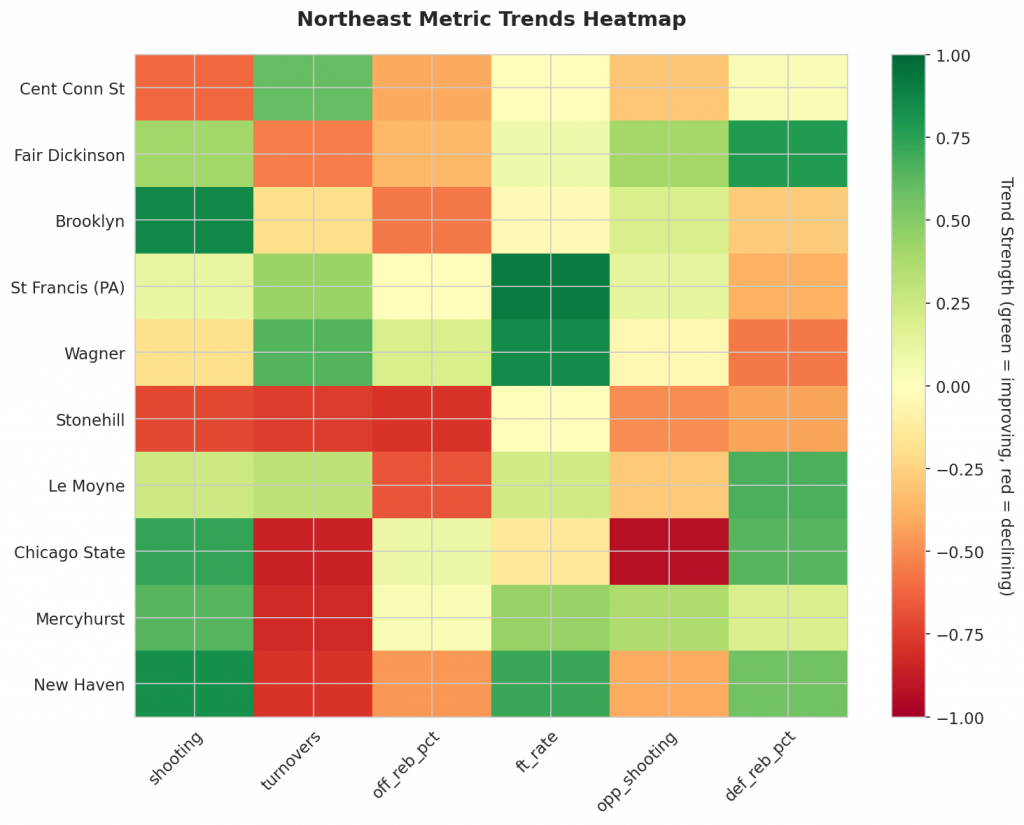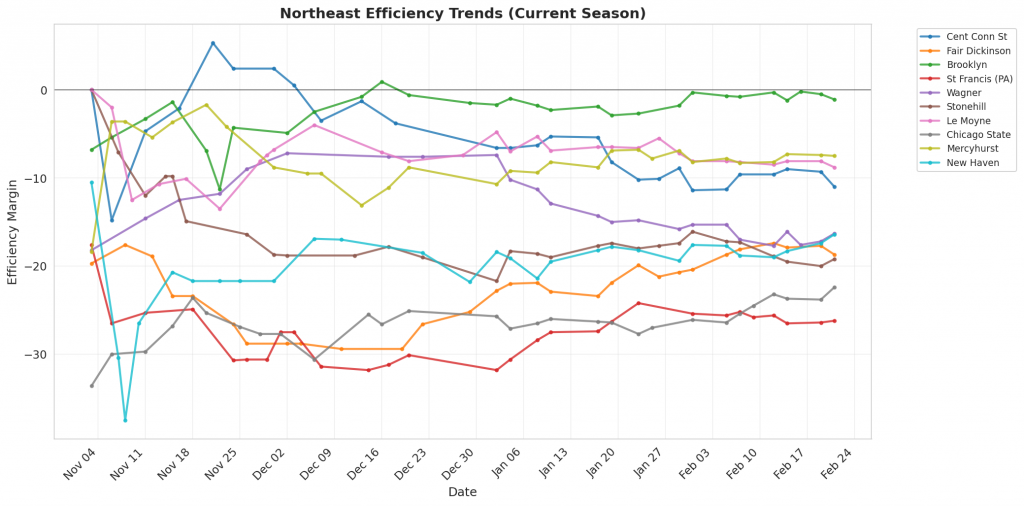Figure 1: Efficiency margin trends for Northeast teams throughout the season. Teams trending upward show improving performance, while downward trends indicate struggles.