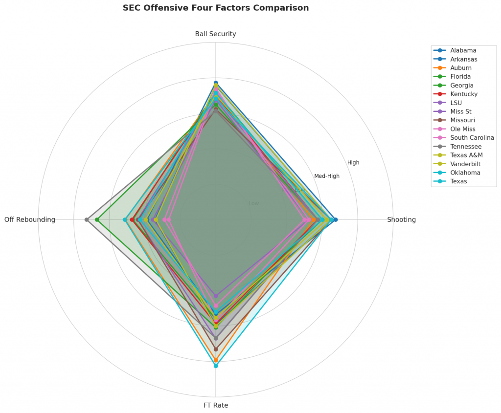 Figure 2: Offensive Four Factors comparison across SEC teams. The radar chart shows each team’s shooting efficiency (eFG%), ball security (TOV%), offensive rebounding (OREB%), and free throw generation (FT Rate).