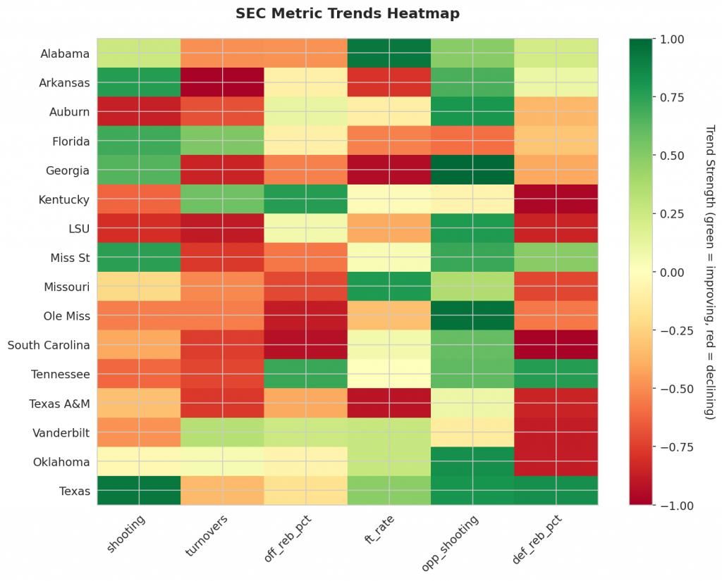 - Trending Down (Efficiency): Auburn, Kentucky, LSU, Missouri, Ole Miss