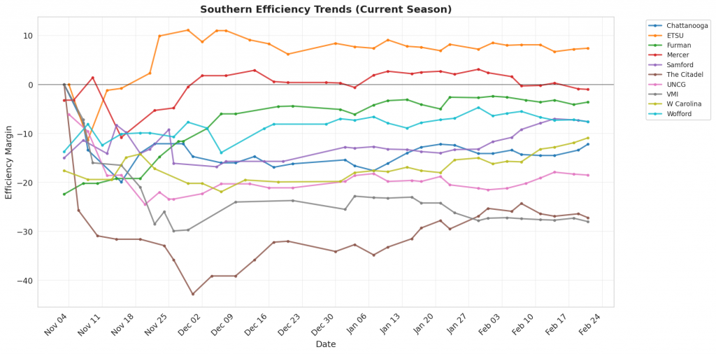 Figure 1: Efficiency margin trends for Southern teams throughout the season. Teams trending upward show improving performance, while downward trends indicate struggles.