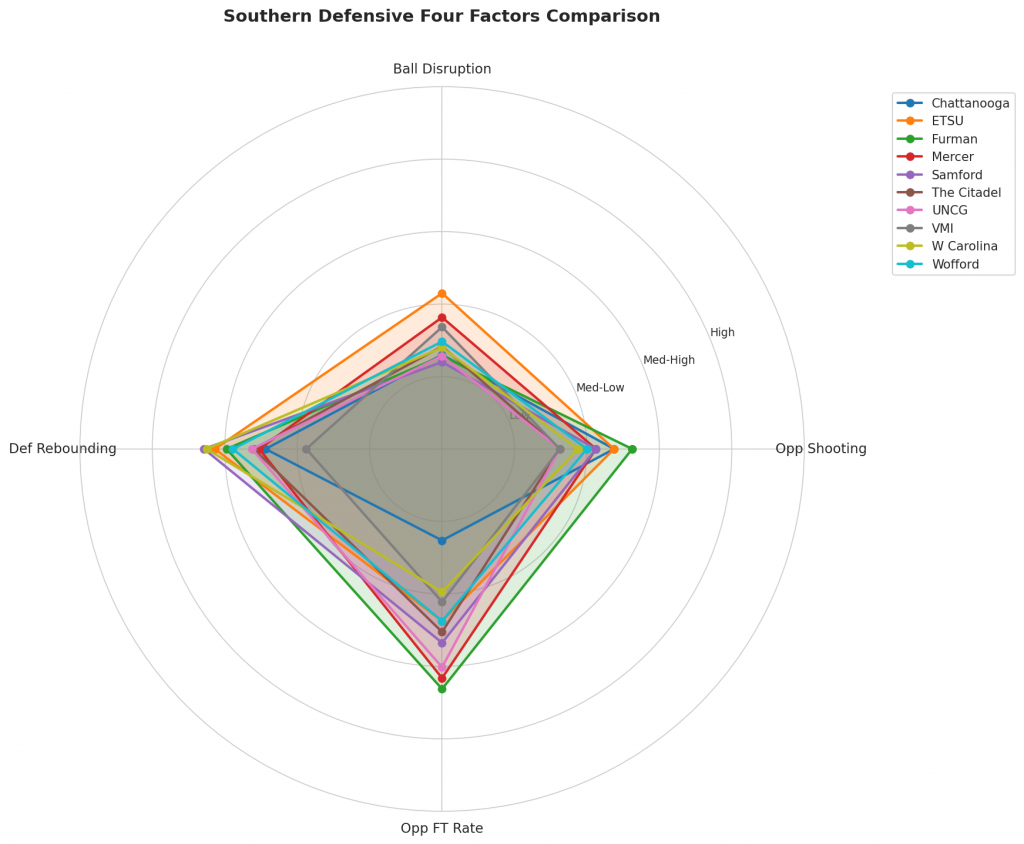 Figure 3: Defensive Four Factors comparison across Southern teams. The radar chart shows each team’s opponent shooting defense (Opp eFG%), ball disruption (forcing TOV%), defensive rebounding (DREB%), and opponent free throw prevention (Opp FT Rate).