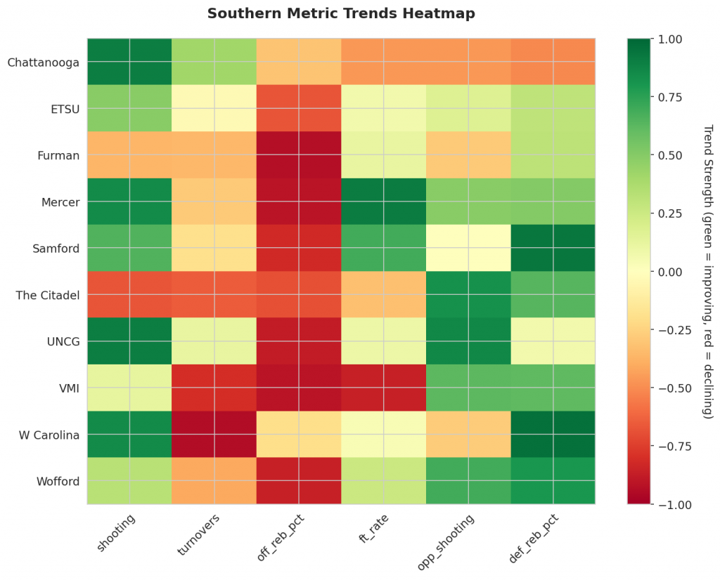 - Trending Up (Efficiency): Chattanooga, ETSU, Mercer, Samford, UNCG