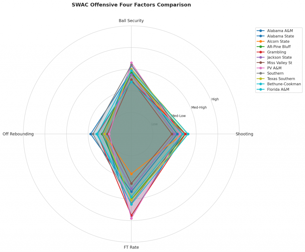 Figure 2: Offensive Four Factors comparison across SWAC teams. The radar chart shows each team’s shooting efficiency (eFG%), ball security (TOV%), offensive rebounding (OREB%), and free throw generation (FT Rate).