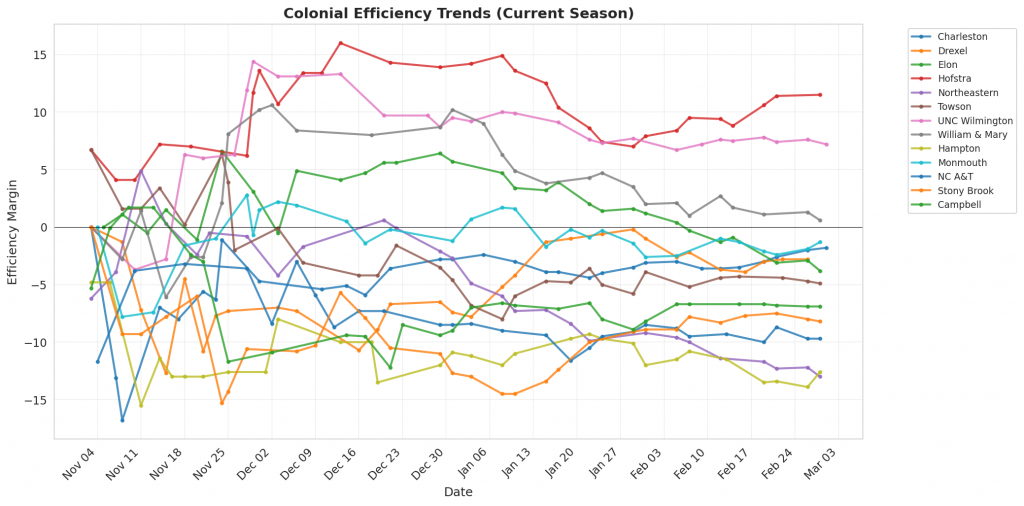Figure 1: Efficiency margin trends for Colonial teams throughout the season. Teams trending upward show improving performance, while downward trends indicate struggles.