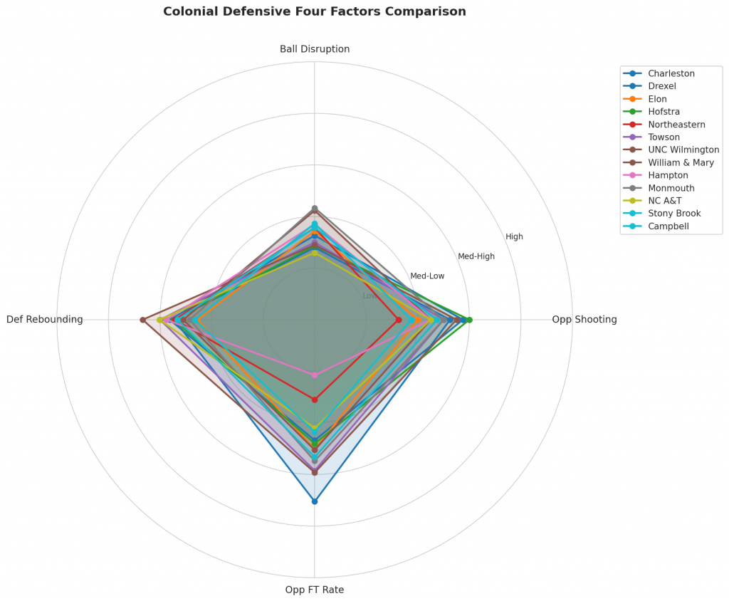 Figure 3: Defensive Four Factors comparison across Colonial teams. The radar chart shows each team’s opponent shooting defense (Opp eFG%), ball disruption (forcing TOV%), defensive rebounding (DREB%), and opponent free throw prevention (Opp FT Rate).