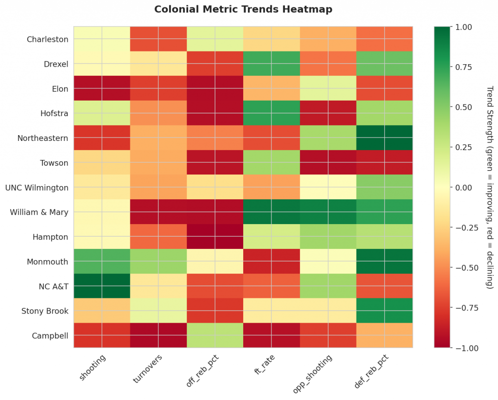 - Trending Down (Efficiency): Drexel, Elon, Northeastern, Towson, UNC Wilmington