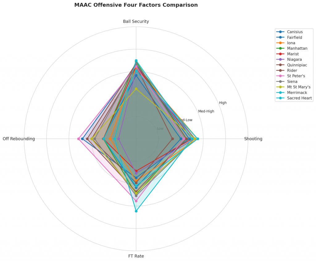 Figure 2: Offensive Four Factors comparison across MAAC teams. The radar chart shows each team’s shooting efficiency (eFG%), ball security (TOV%), offensive rebounding (OREB%), and free throw generation (FT Rate).