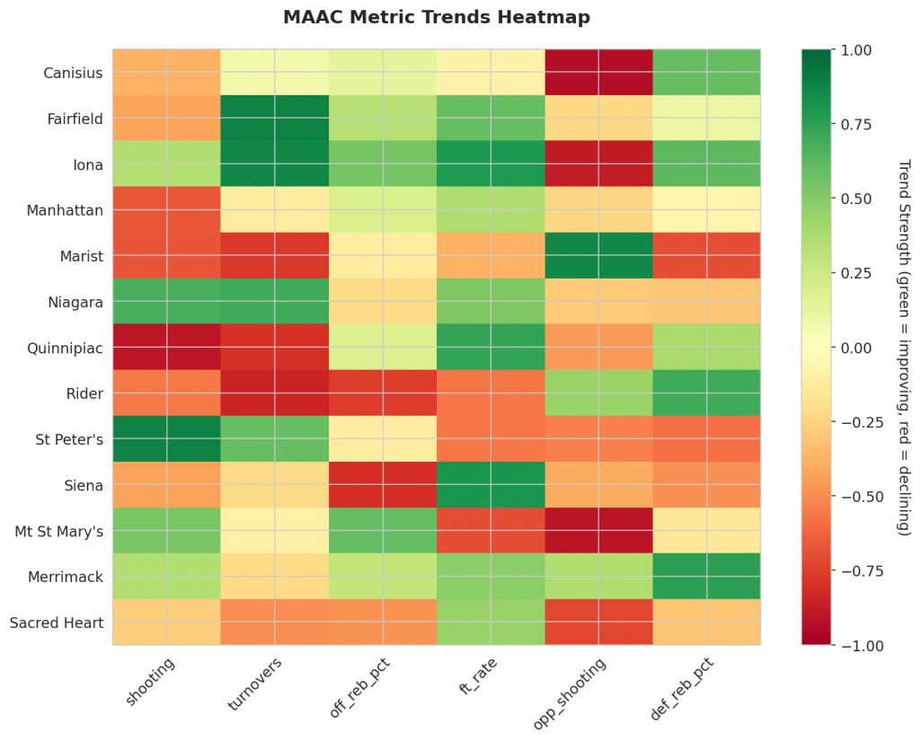 Fairfield’s tendency to commit turnovers is trending up strongly (0.151 turnovers per game). This struggle to maintain possession further exacerbates their fragile offense. In contrast, Manhattan and Marist have both seen declines in shooting percentages, indicating an improvement in their offensive performance.