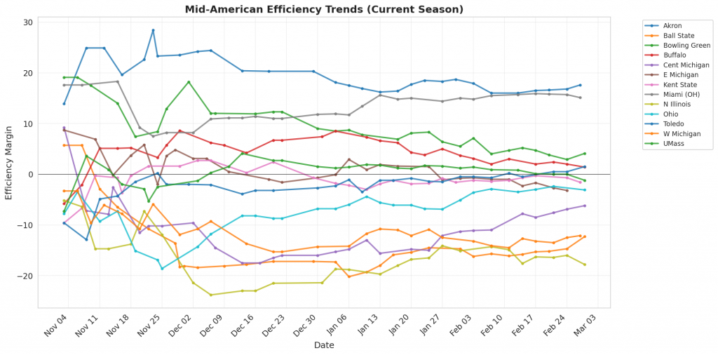 Figure 1: Efficiency margin trends for Mid-American teams throughout the season. Teams trending upward show improving performance, while downward trends indicate struggles.