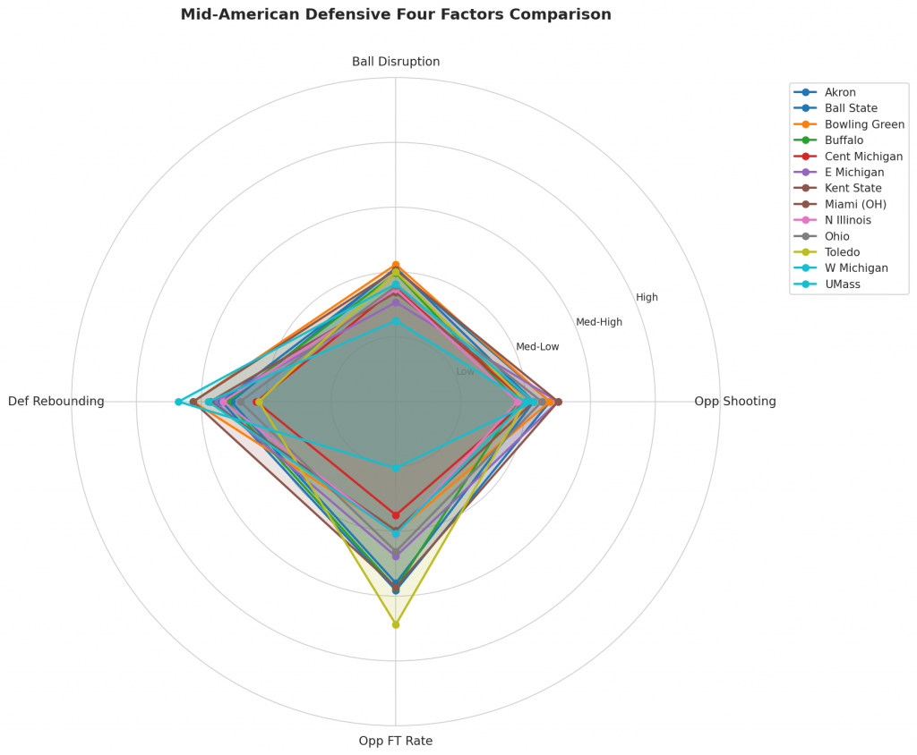 Figure 3: Defensive Four Factors comparison across Mid-American teams. The radar chart shows each team’s opponent shooting defense (Opp eFG%), ball disruption (forcing TOV%), defensive rebounding (DREB%), and opponent free throw prevention (Opp FT Rate).