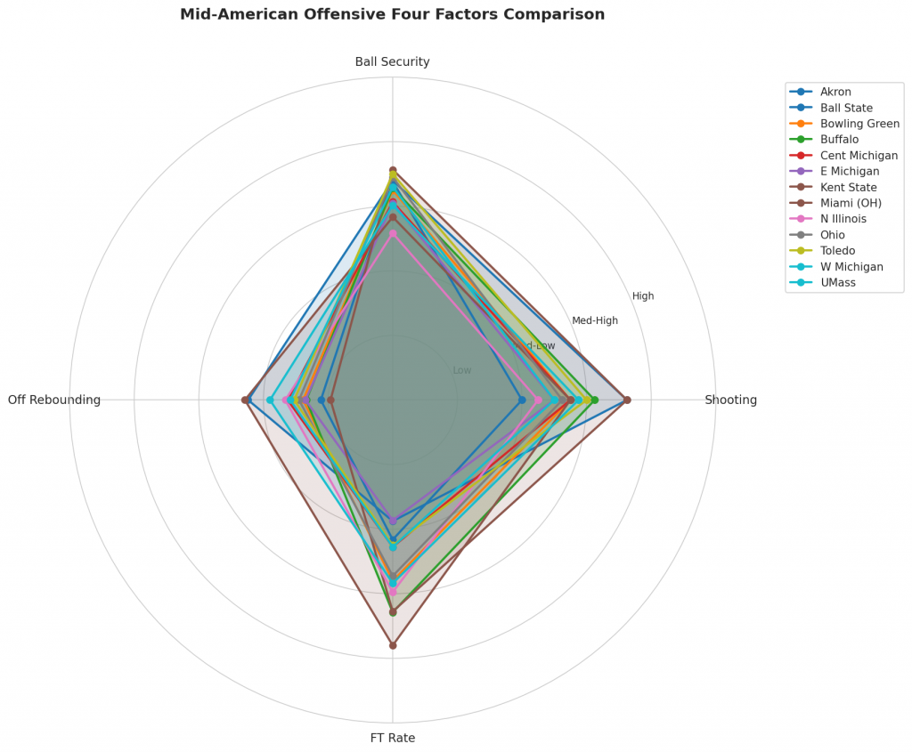 Figure 2: Offensive Four Factors comparison across Mid-American teams. The radar chart shows each team’s shooting efficiency (eFG%), ball security (TOV%), offensive rebounding (OREB%), and free throw generation (FT Rate).
