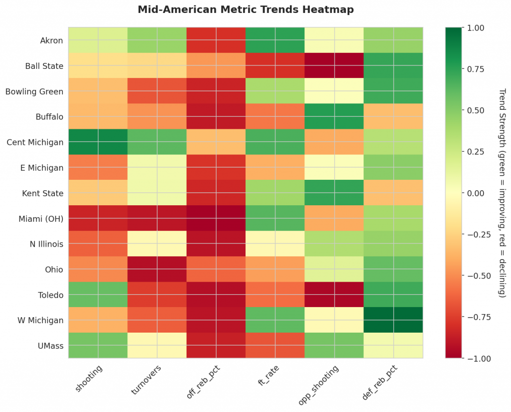 - Trending Down (Efficiency): Ball State, Bowling Green, Buffalo, E Michigan, Kent State