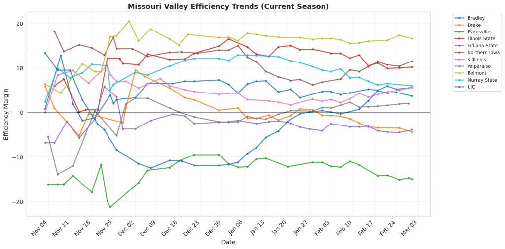 Figure 1: Efficiency margin trends for Missouri Valley teams throughout the season. Teams trending upward show improving performance, while downward trends indicate struggles.