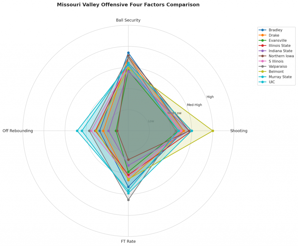 Figure 2: Offensive Four Factors comparison across Missouri Valley teams. The radar chart shows each team’s shooting efficiency (eFG%), ball security (TOV%), offensive rebounding (OREB%), and free throw generation (FT Rate).