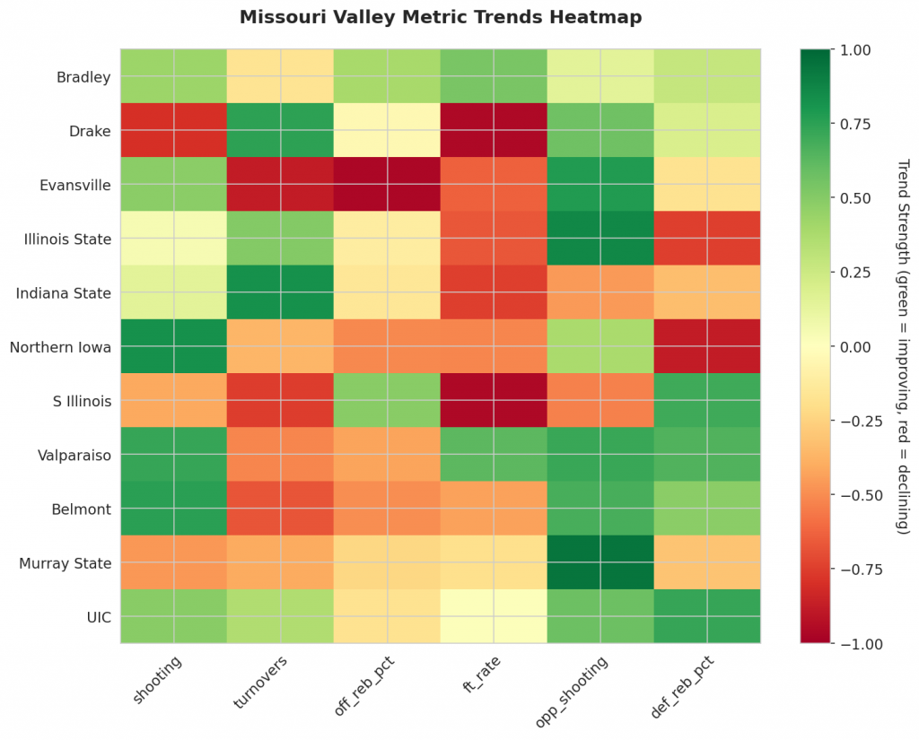 - Trending Up (Efficiency): Bradley, Evansville, Illinois State, Indiana State, Northern Iowa