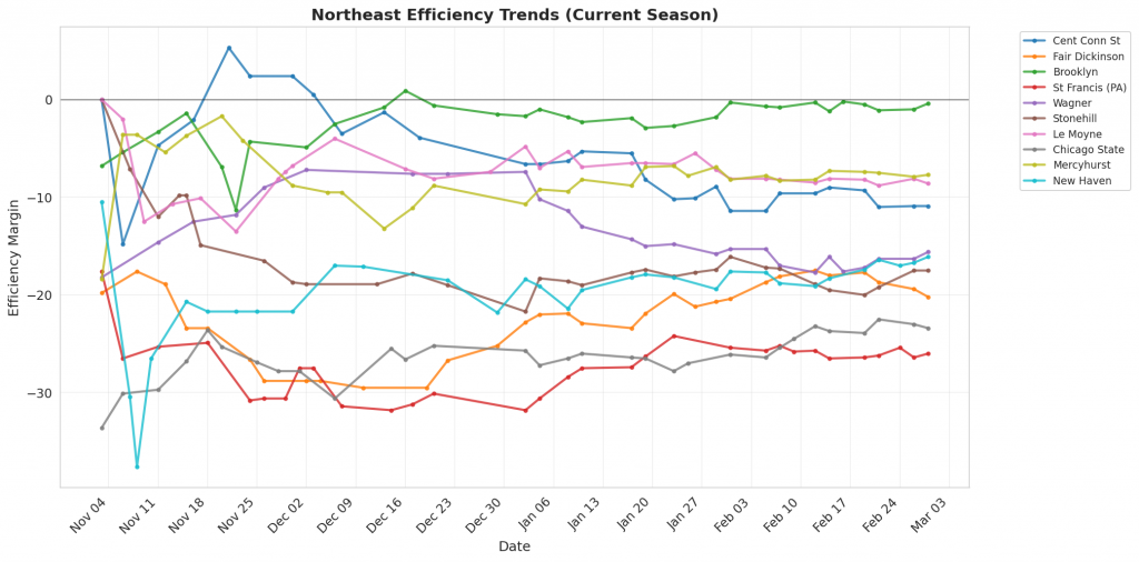 Figure 1: Efficiency margin trends for Northeast teams throughout the season. Teams trending upward show improving performance, while downward trends indicate struggles.