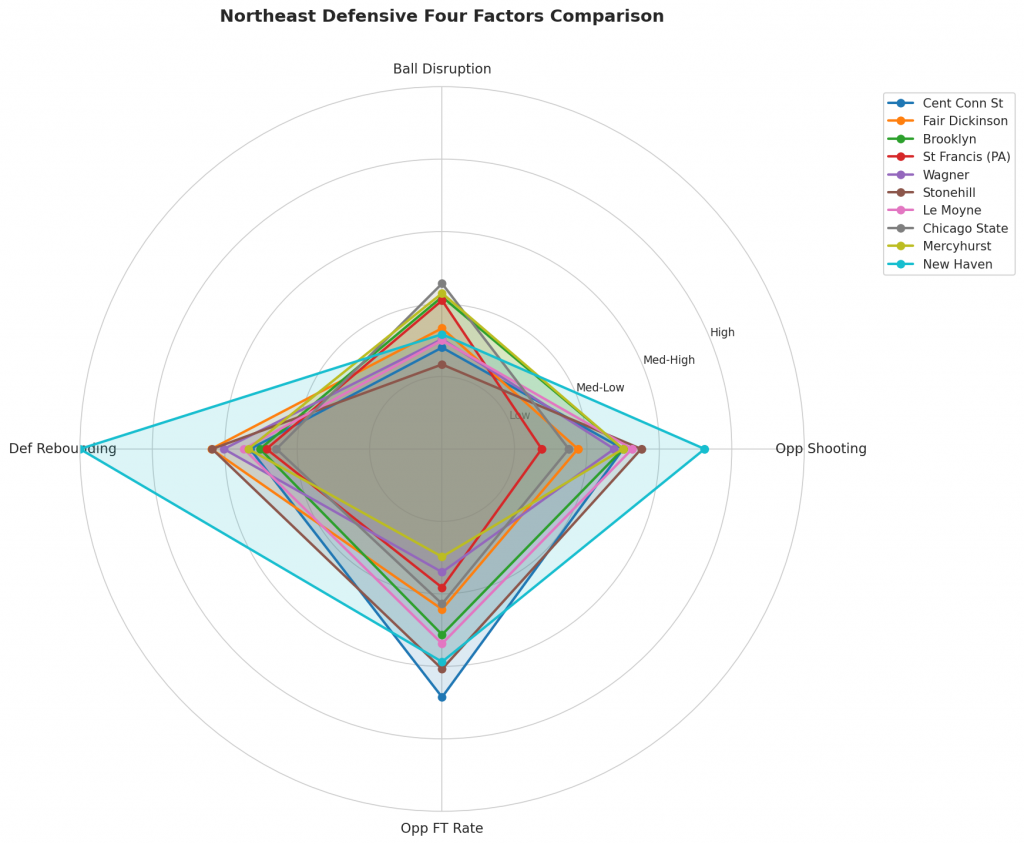 Figure 3: Defensive Four Factors comparison across Northeast teams. The radar chart shows each team’s opponent shooting defense (Opp eFG%), ball disruption (forcing TOV%), defensive rebounding (DREB%), and opponent free throw prevention (Opp FT Rate).