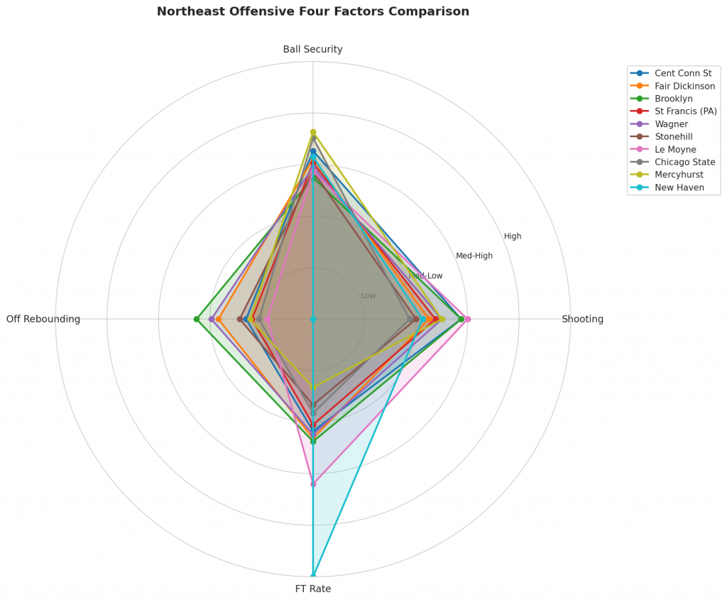 Figure 2: Offensive Four Factors comparison across Northeast teams. The radar chart shows each team’s shooting efficiency (eFG%), ball security (TOV%), offensive rebounding (OREB%), and free throw generation (FT Rate).