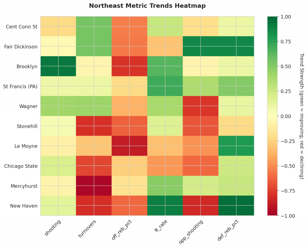 - Trending Up (Efficiency): Brooklyn, St Francis (PA), Wagner, Stonehill, Chicago State