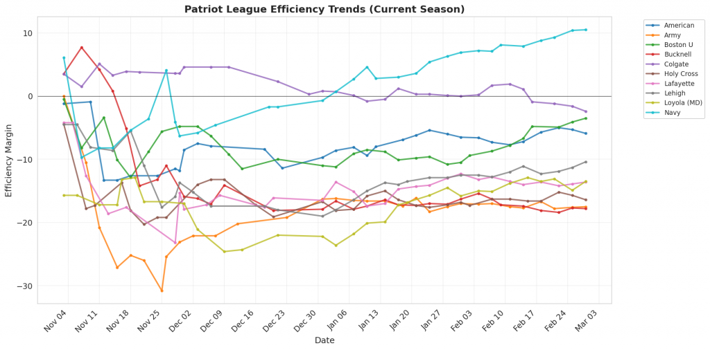Figure 1: Efficiency margin trends for Patriot League teams throughout the season. Teams trending upward show improving performance, while downward trends indicate struggles.