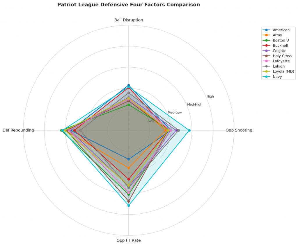Figure 3: Defensive Four Factors comparison across Patriot League teams. The radar chart shows each team’s opponent shooting defense (Opp eFG%), ball disruption (forcing TOV%), defensive rebounding (DREB%), and opponent free throw prevention (Opp FT Rate).