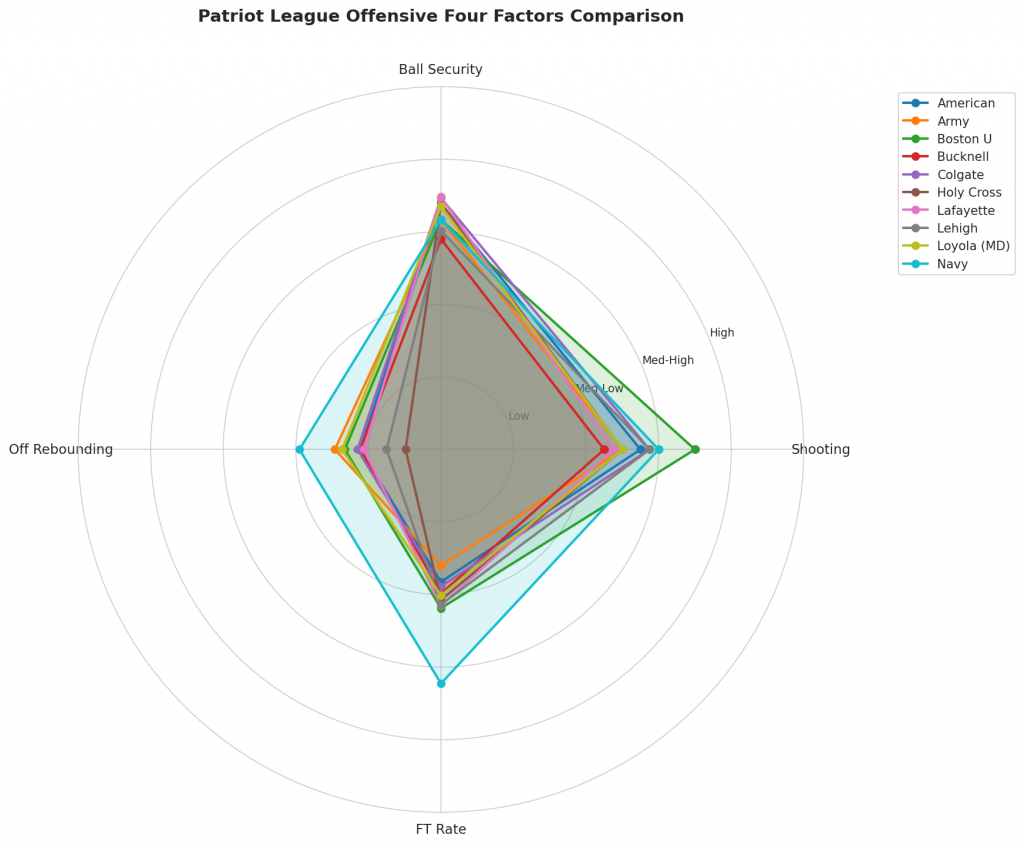 Figure 2: Offensive Four Factors comparison across Patriot League teams. The radar chart shows each team’s shooting efficiency (eFG%), ball security (TOV%), offensive rebounding (OREB%), and free throw generation (FT Rate).
