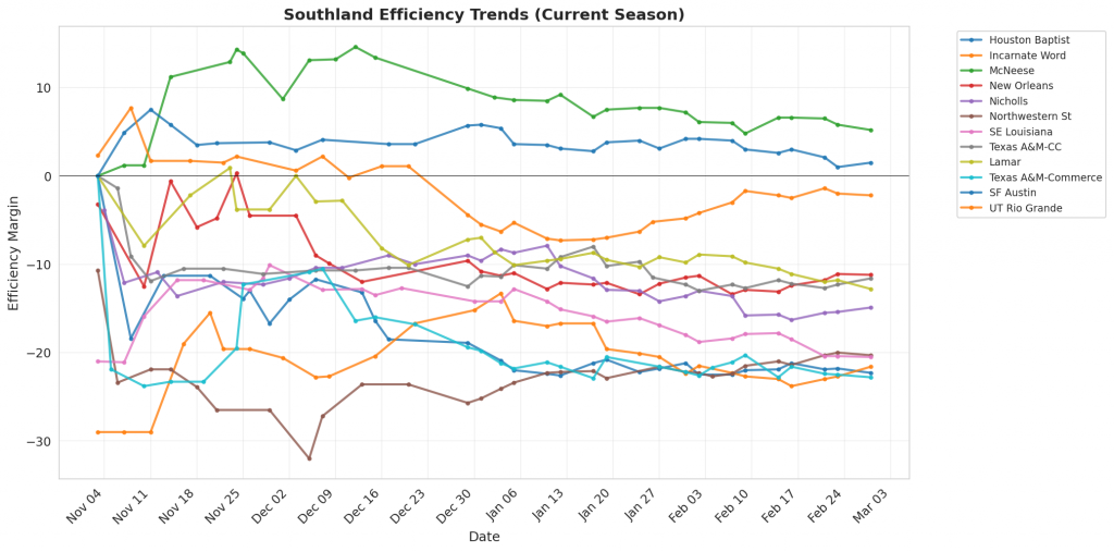 Figure 1: Efficiency margin trends for Southland teams throughout the season. Teams trending upward show improving performance, while downward trends indicate struggles.