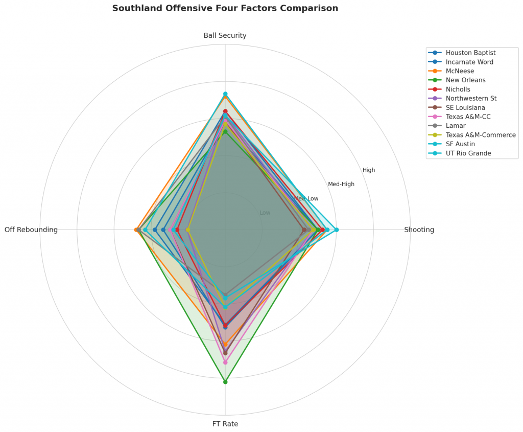 Figure 2: Offensive Four Factors comparison across Southland teams. The radar chart shows each team’s shooting efficiency (eFG%), ball security (TOV%), offensive rebounding (OREB%), and free throw generation (FT Rate).