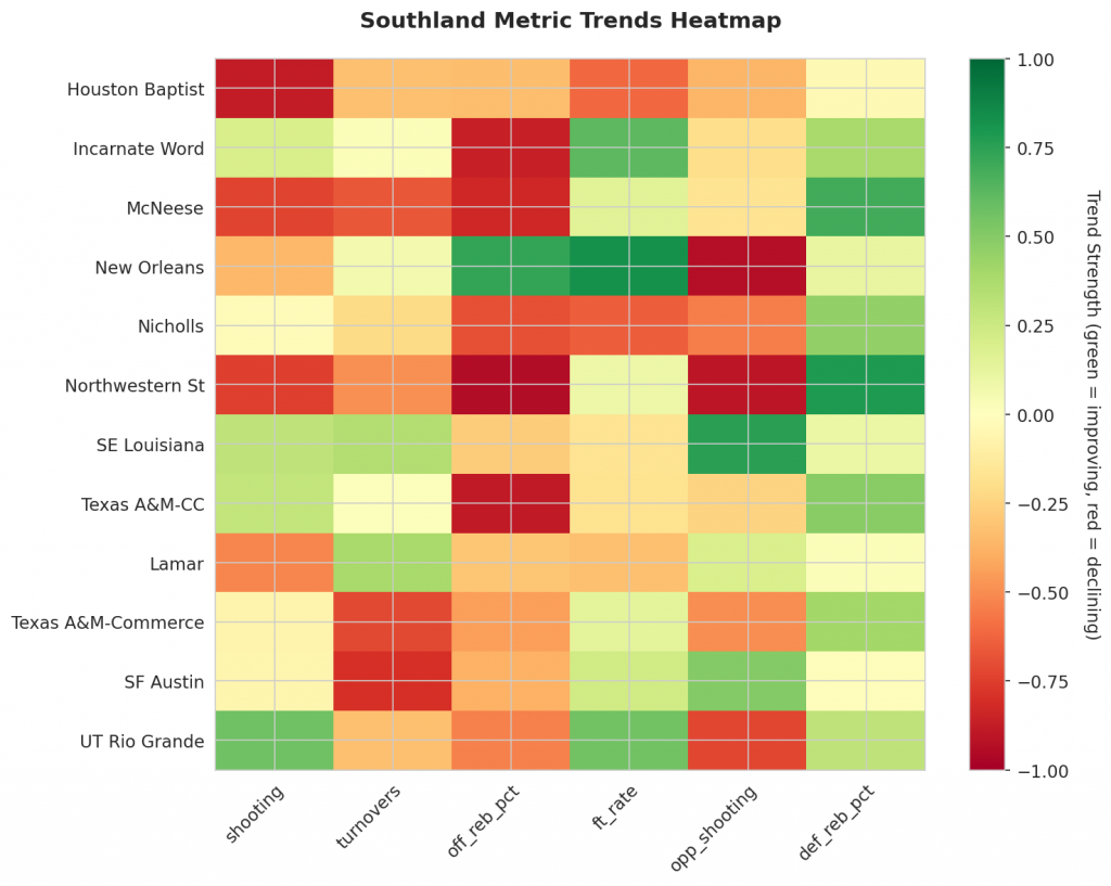 The MACD momentum indicators provide valuable insights into each team’s trajectory, helping identify which teams are genuinely improving versus those riding unsustainable momentum. Specifically, the indicator measures the difference in the rate of change between the team’s shooting and rebounding percentages. The data will be used to inform further analysis of the Southland conference as the season unfolds.