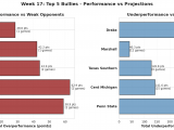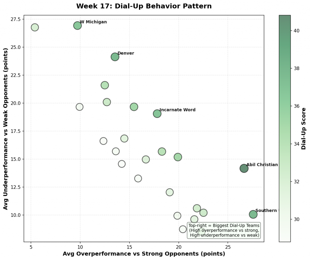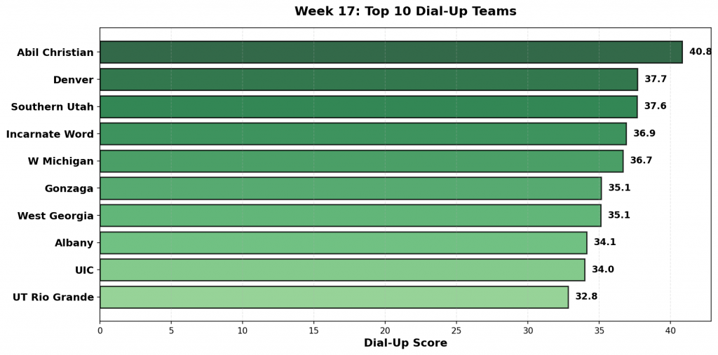 Figure 1: Top 10 teams with the highest Dial-Up scores in Week 17. Scores reflect the combination of overperformance against strong opponents and underperformance against weak ones.