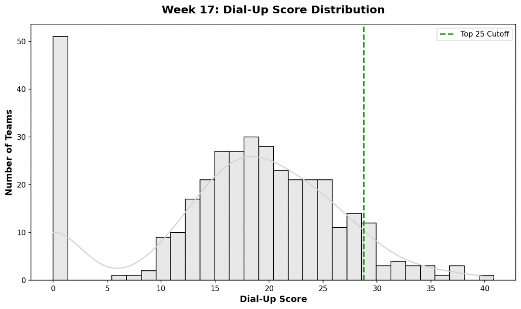 Figure 4: Distribution of Dial-Up scores across all Division I teams. The top 25 teams (highlighted in green) represent those with the most extreme performance splits based on opponent quality.