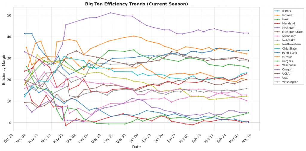Figure 1: Efficiency margin trends for Big Ten teams throughout the season. Teams trending upward show improving performance, while downward trends indicate struggles.