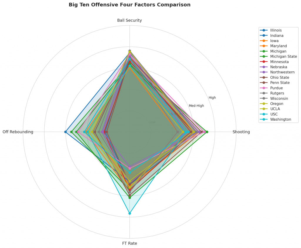 Figure 2: Offensive Four Factors comparison across Big Ten teams. The radar chart shows each team’s shooting efficiency (eFG%), ball security (TOV%), offensive rebounding (OREB%), and free throw generation (FT Rate).