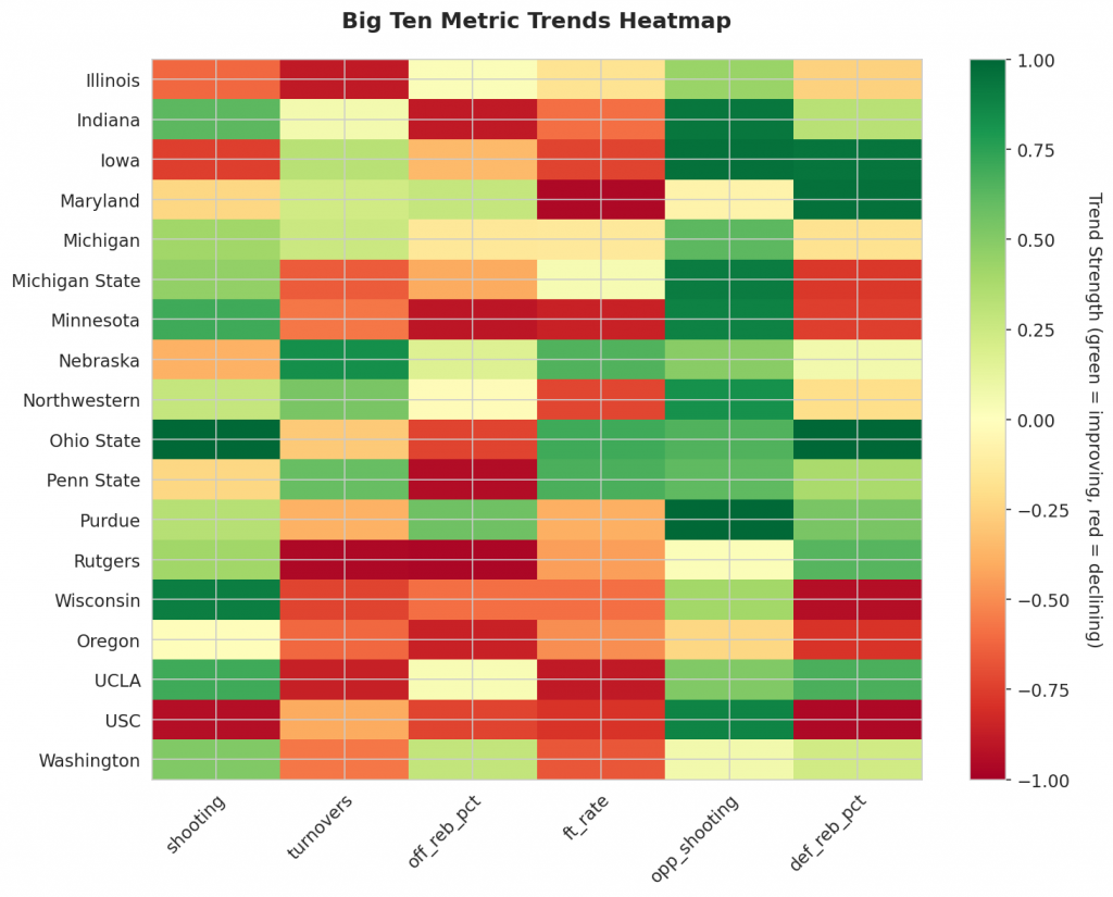 - Trending Up (Efficiency): Indiana, Michigan, Michigan State, Minnesota, Northwestern
