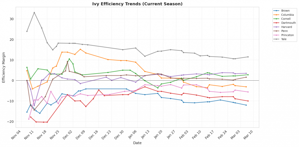 Figure 1: Efficiency margin trends for Ivy teams throughout the season. Teams trending upward show improving performance, while downward trends indicate struggles.