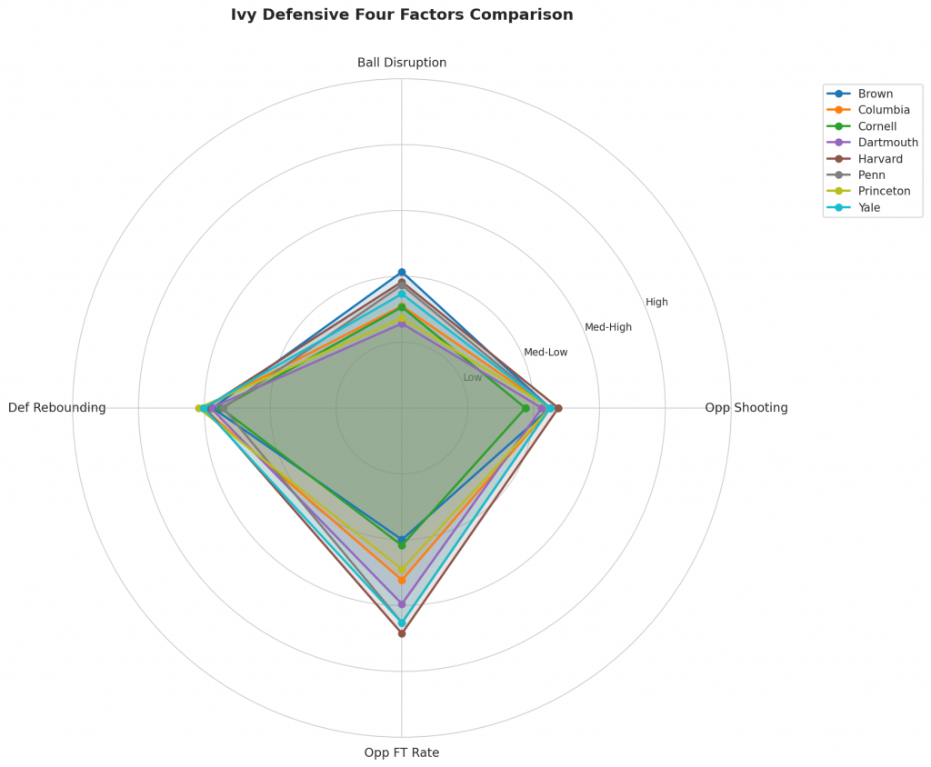 Figure 3: Defensive Four Factors comparison across Ivy teams. The radar chart shows each team’s opponent shooting defense (Opp eFG%), ball disruption (forcing TOV%), defensive rebounding (DREB%), and opponent free throw prevention (Opp FT Rate).