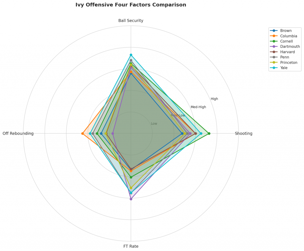 Figure 2: Offensive Four Factors comparison across Ivy teams. The radar chart shows each team’s shooting efficiency (eFG%), ball security (TOV%), offensive rebounding (OREB%), and free throw generation (FT Rate).