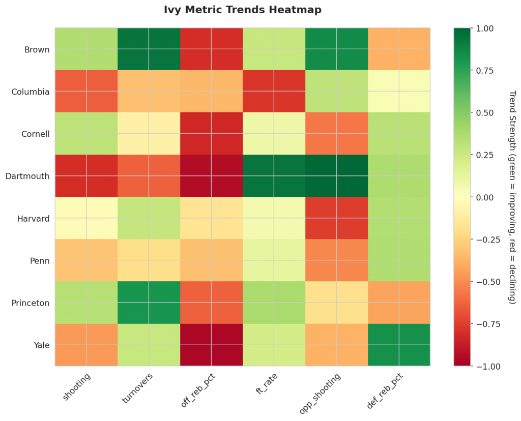 - Dartmouth, Shooting, Down, Trend Strength: -0.014 – Dartmouth’s shooting struggles have been a problem throughout their season, characterized by inconsistent field goal attempts and a lack of scoring reliability.