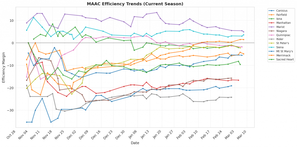 Figure 1: Efficiency margin trends for MAAC teams throughout the season. Teams trending upward show improving performance, while downward trends indicate struggles.