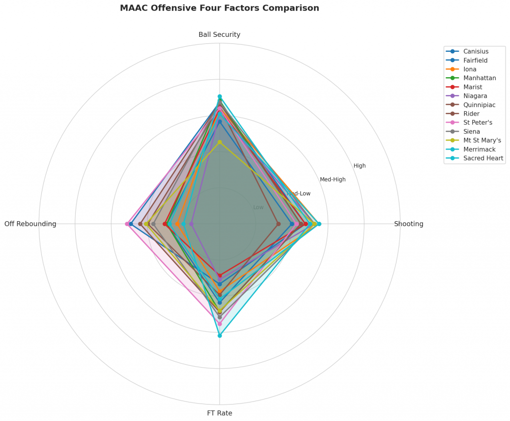 Figure 2: Offensive Four Factors comparison across MAAC teams. The radar chart shows each team’s shooting efficiency (eFG%), ball security (TOV%), offensive rebounding (OREB%), and free throw generation (FT Rate).