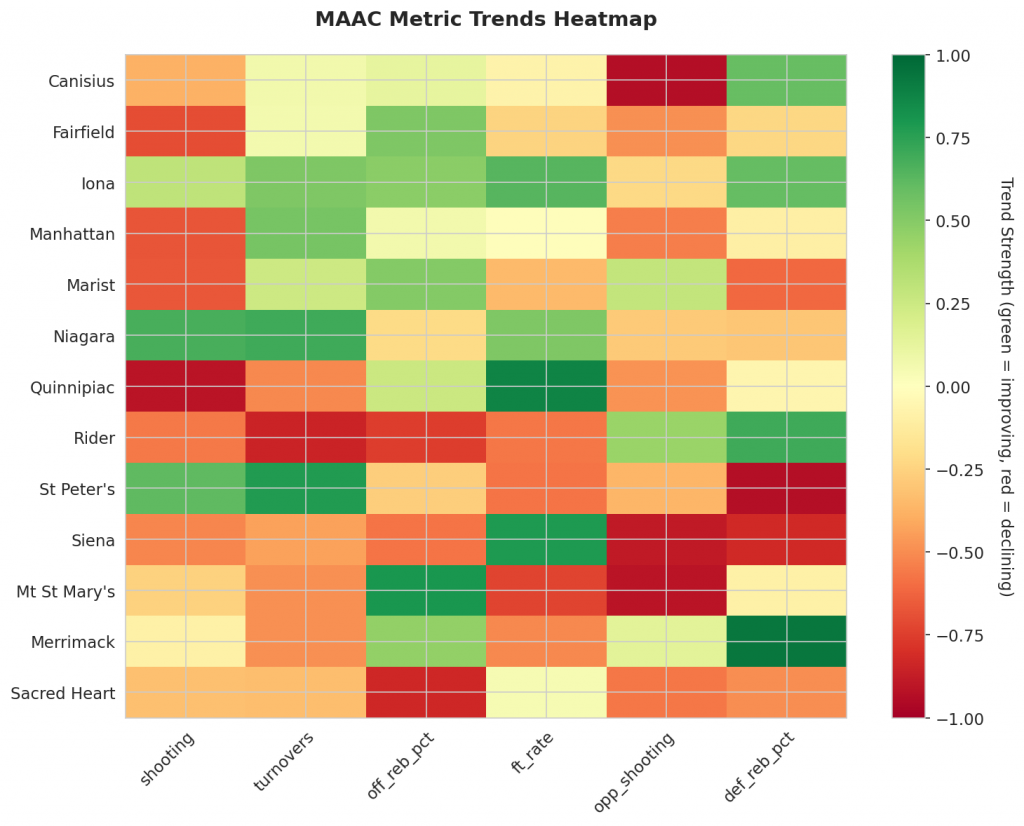 - Trending Down (Efficiency): Canisius, Fairfield, Manhattan, Marist, Quinnipiac