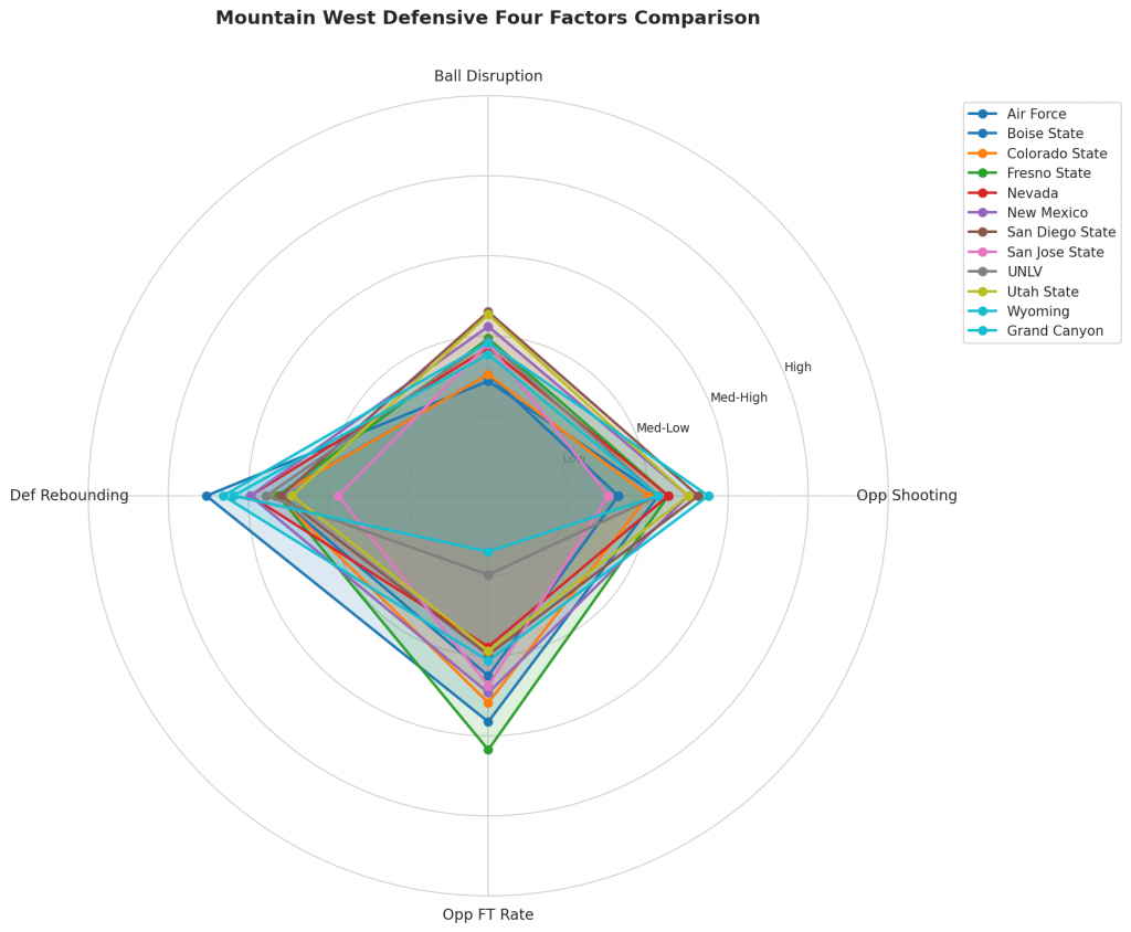 Figure 3: Defensive Four Factors comparison across Mountain West teams. The radar chart shows each team’s opponent shooting defense (Opp eFG%), ball disruption (forcing TOV%), defensive rebounding (DREB%), and opponent free throw prevention (Opp FT Rate).