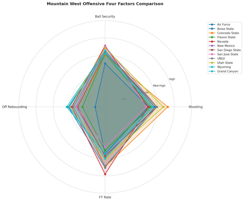 Figure 2: Offensive Four Factors comparison across Mountain West teams. The radar chart shows each team’s shooting efficiency (eFG%), ball security (TOV%), offensive rebounding (OREB%), and free throw generation (FT Rate).